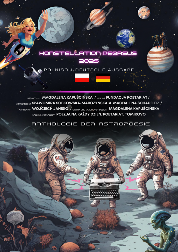 Liebe poetische Seelen aus Polen und Deutschland! Spüren Sie den Ruf der Sterne? Schlagen Ihre Herzen im Rhythmus des Universums und bilden Ihre Worte Sternbilder? Die Stiftung Poetariat lädt Sie herzlich ein, an einem außergewöhnlichen Projekt mitzuwirken – einer polnisch-deutschen Gedichtanthologie mit dem Titel „Pegasus Constellation 2025“!